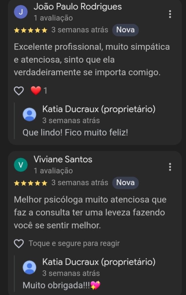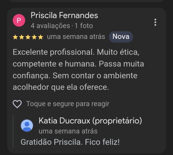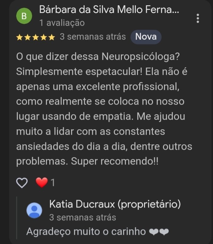 Meu nome é Katia Mello Ducraux, sou Psicóloga, Especialista em Transtorno do Espectro Autista (TEA), Especialista em Análise do Comportamento Aplicada ( ABA) e Especialista Neuropsicóloga com ênfase em Testes Psicológicos.